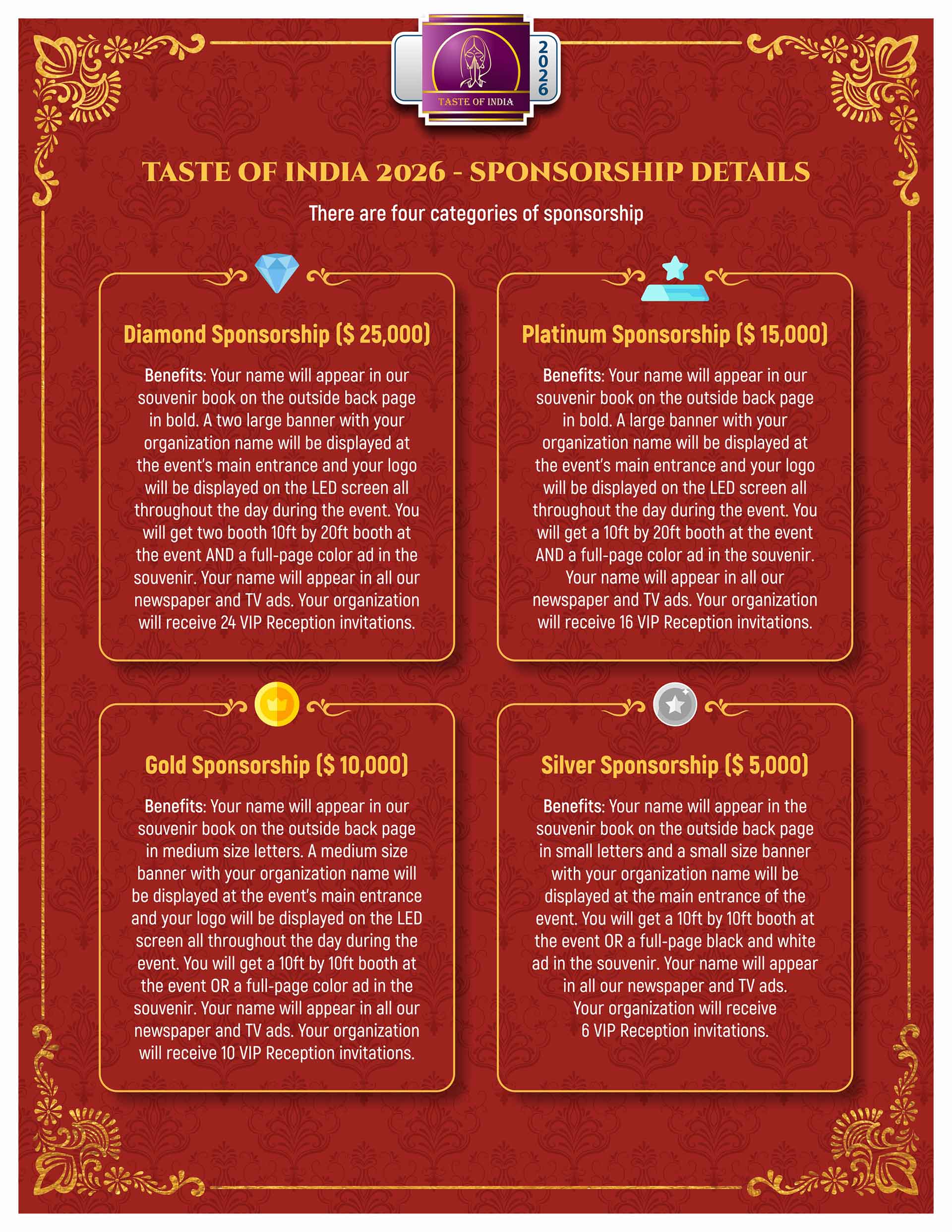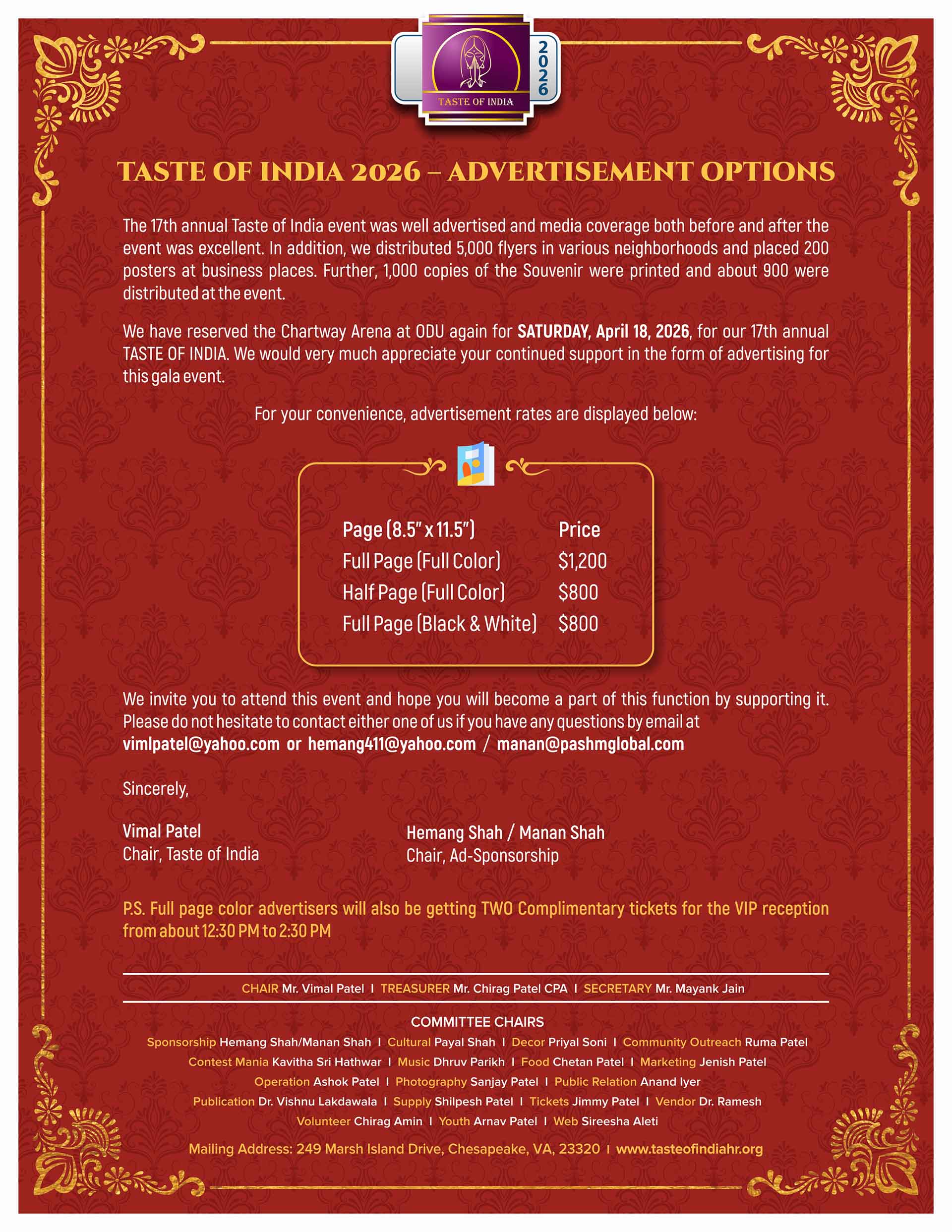 If you are interested in becoming a Taste of India 2026 Sponsor or advertising in the event Souvenir, please contact either one of us if you have any questions by email at